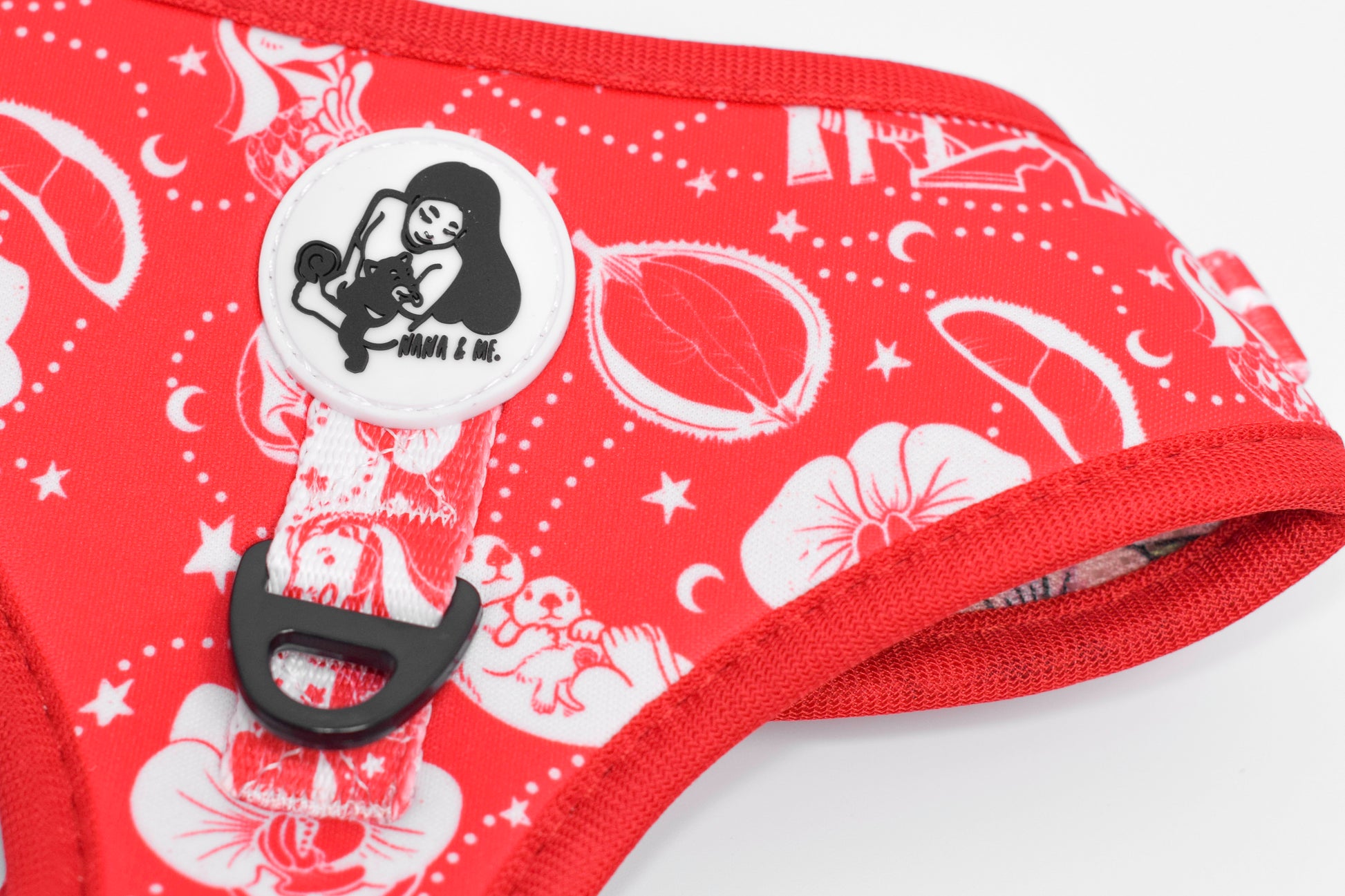 Grab some S'pore vibes with this double-sided adjustable harness, featuring some of the most popular elements of Singapore - Merlion, orchids, dragon playground, otters, durians.